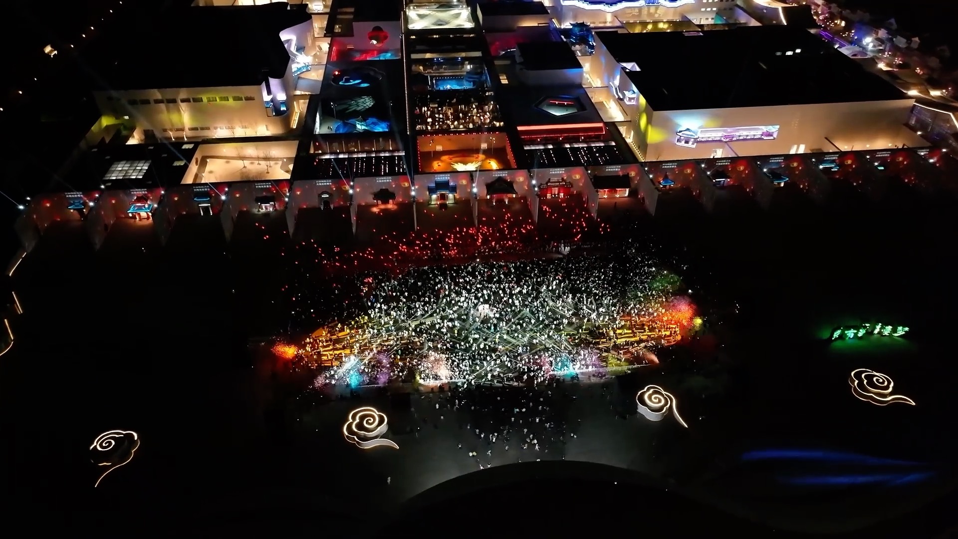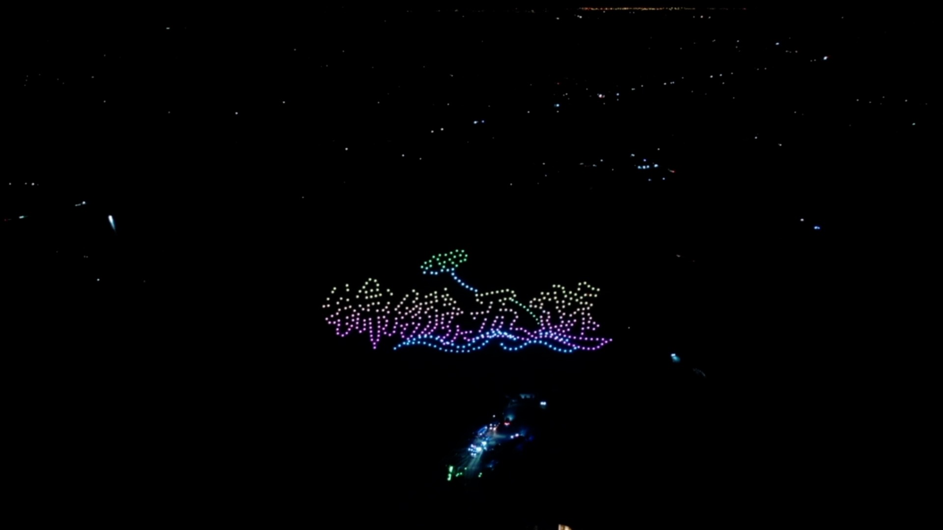 在五莲山景区,无人机编队以夜空为幕,变幻出“2026”“锦绣五莲”等字样与图案,绚丽光影点亮节日氛围,吸引众多游客驻足观赏。